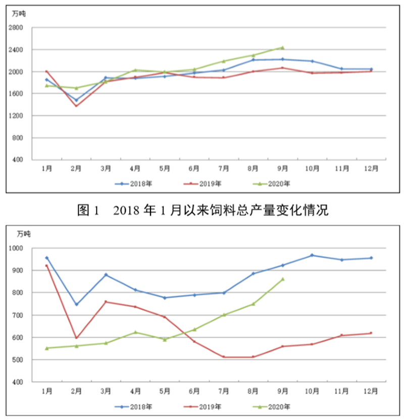 据截至10月9日已填报企业测算,2020年9月,饲料总产量2440万吨,环比增长6.2%,同比增长18.1%。从品种看,9月猪饲料产量861万吨,环比增长14.8%,同比增长53.7%,连续4个月同比增长。蛋禽饲料产量291万吨,同比增长6.1%,环比增长5.7%。肉禽饲料产量854万吨,同比增长10.5%,环比增长4.4%。水产饲料产量286万吨,同比下降10.4%,环比下降10.0%。反刍动物饲料产量112万吨,同比增长9.9%,环比增长9.6%。